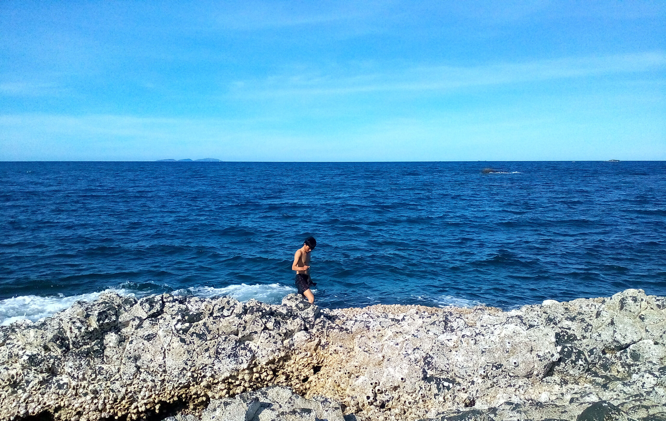 Đặt chân đến Hòn Nhàn, chúng tôi ngỡ ngàng trước vẻ đẹp quyến rũ của cảnh quang nơi đây. Hòn Nhàn cách bờ biển khoảng 10 – 15 phút đi tàu. Ngồi trên tàu của thuyền trưởng trẻ tuổi 9X Phạm Thái Viên, chúng tôi mang theo cảm giác hồi hộp xen lẫn hào hứng khi băng qua từng con sóng. Khoảng 14 giờ, trời êm, lặng gió, trên đường đến Hòn Nhàn ánh mặt trời rực rỡ giúp chúng tôi dễ dàng quan sát, ngắm nhìn từng mảng sinh vật biển lượn lờ trong sóng nước. Từng chùm rong mơ đung đưa, từng đàn cá, tôm nối đuôi nhau bơi lượn…